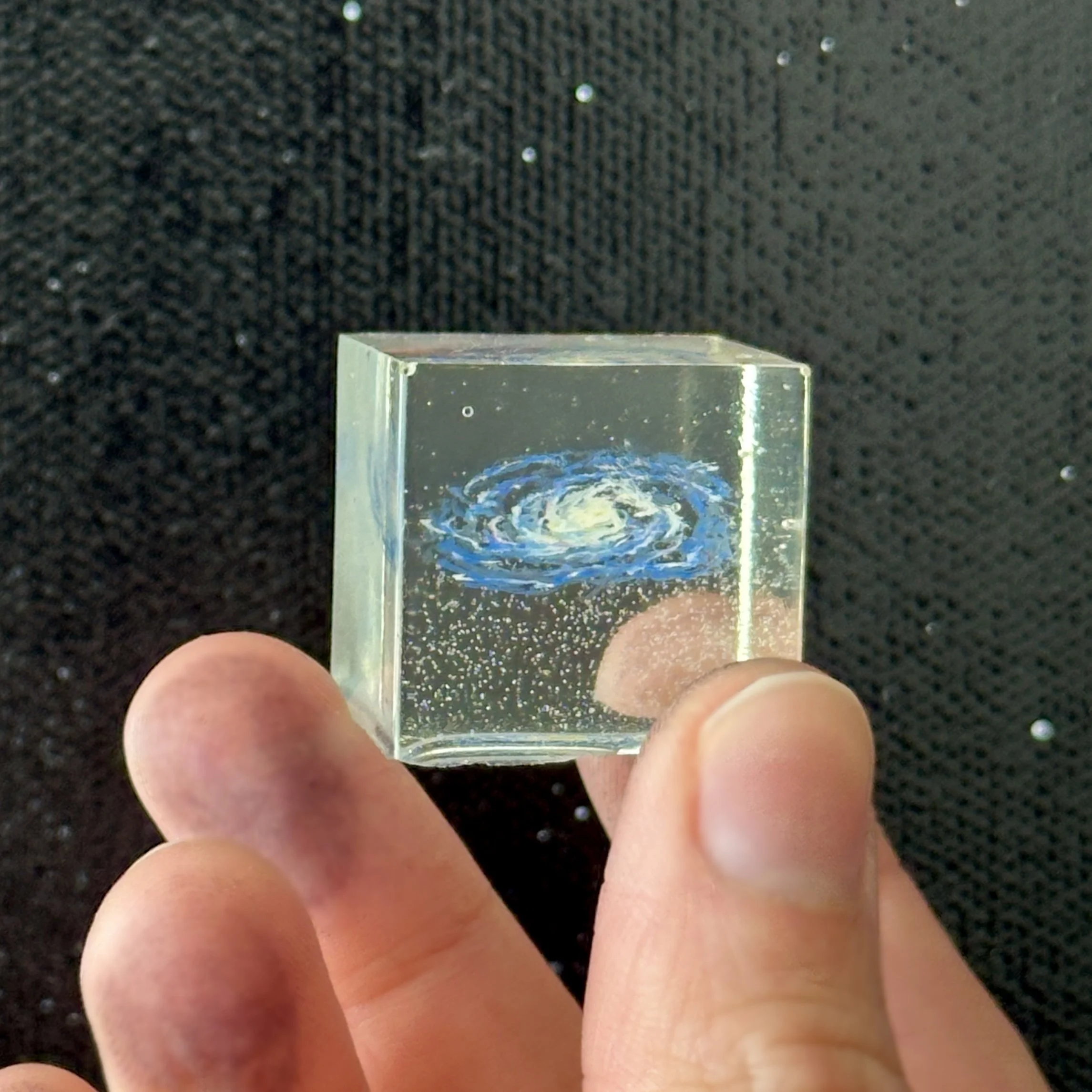 Dimensions in Dust is a series of resin cubes with galaxies and nebulas inside. This work plays with scale. Holding and view a galaxy at this scale can make one reflect on life’s magnitude and the majesty of space. Start Dust is rooted in the Overview Effect; an overwhelming cognitive shift astronauts feel when they look back at the Earth from space. they see the Earth as one, beyond the range of politics and borders.